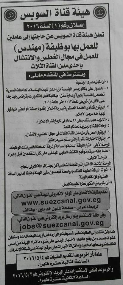 وظائف قناة السويس - إعلان رقم 1 لعام 2016 - إعلان 17-4-2016 مطلوب مهندسين . التفاصيل بالإعلان التالي :